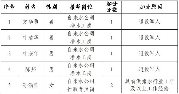 根據(jù)《黃山市徽城投資集團(tuán)有限公司招聘公告》規(guī)定,“對(duì)報(bào)名參加自來水公司凈水工崗位的考生如滿足退役軍人身份給予綜合成績(jī)加1分,榮獲個(gè)人三等功以上的退役軍人給予綜合成績(jī)加2分,具有供排水行業(yè)1年及以上工作經(jīng)驗(yàn)者給予綜合成績(jī)加2分。對(duì)報(bào)名參加自來水公司行政專員崗位的考生如具有供排水行業(yè)1年及以上工作經(jīng)驗(yàn)者給予綜合成績(jī)加2分”。現(xiàn)對(duì)報(bào)考人員申請(qǐng)加分的審核工作已全部結(jié)束,經(jīng)審核符合加分條件的人員共5人,現(xiàn)予以公示,接受社會(huì)監(jiān)督。公示時(shí)間為2020年11月13日—11月15日。公示期間,如對(duì)加分情況有異議,請(qǐng)向黃山市徽投集團(tuán)反映。公示期滿后,如無(wú)異議的,按規(guī)定程序辦理加分手續(xù),逾期不再補(bǔ)辦。聯(lián)系電話:0559-6525368,15665592628。