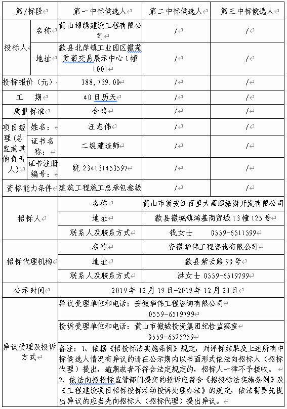 安徽華偉工程咨詢有限公司受黃山市新安江百里大畫廊旅游開發(fā)有限公司的委托,對(SXGC2019HWX092、歙縣綿潭鄉(xiāng)村小劇院改造工程)進(jìn)行(小型項(xiàng)目招標(biāo)),本項(xiàng)目于(2019年12月19日)在(黃山市新安江百里大畫廊旅游開發(fā)有限公司)開標(biāo)、評標(biāo),現(xiàn)根據(jù)有關(guān)法律、法規(guī)要求,對中標(biāo)候選人進(jìn)行公示。