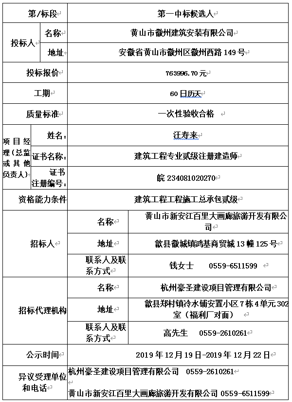 杭州豪圣建設(shè)項(xiàng)目管理有限公司受黃山市新安江百里大畫廊旅游開發(fā)有限公司的委托,對(duì)(歙縣深渡鎮(zhèn)糧庫改造工程)進(jìn)行(小型項(xiàng)目招標(biāo)),本項(xiàng)目于(2019年12月19日)在(黃山市新安江百里大畫廊旅游開發(fā)有限公司)開標(biāo)、評(píng)標(biāo),現(xiàn)根據(jù)有關(guān)法律、法規(guī)要求,對(duì)中標(biāo)候選人進(jìn)行公示。