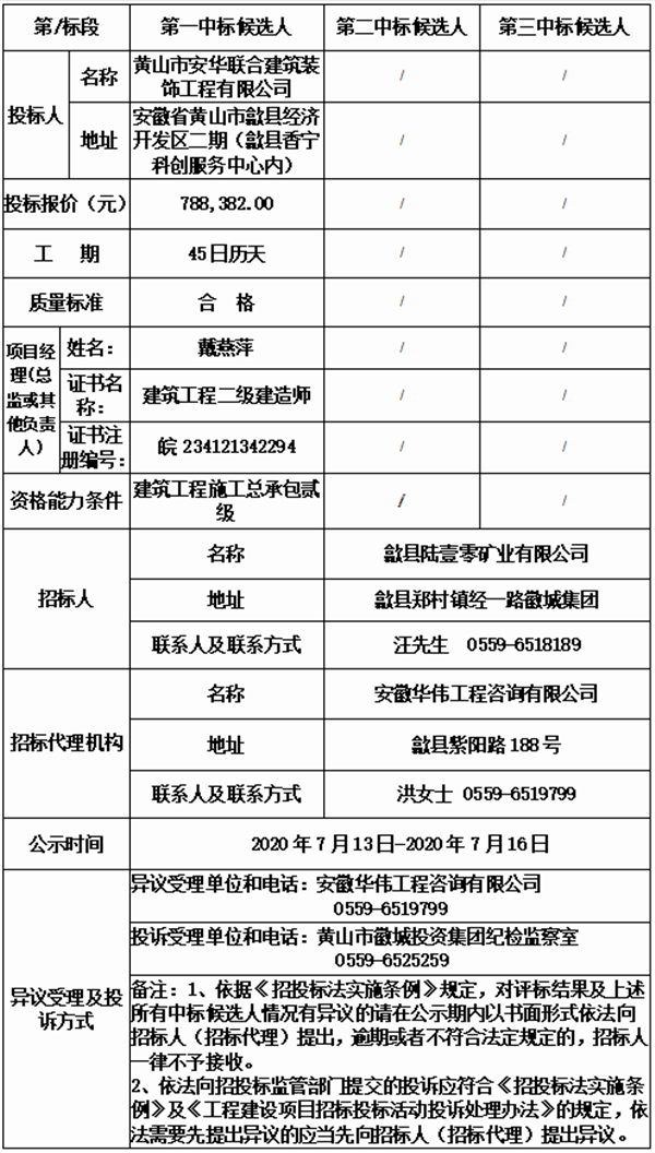 安徽華偉工程咨詢有限公司受歙縣陸壹零礦業(yè)有限公司的委托,對(duì)(HJSGC2020HWSY029、歙縣陸壹零礦業(yè)有限公司門衛(wèi)室及附屬工程、辦公樓、廚房、餐廳改造及附屬工程)進(jìn)行(小型項(xiàng)目邀請(qǐng)招標(biāo)),本項(xiàng)目于(2020年7月13日)在(歙縣陸壹零礦業(yè)有限公司)開(kāi)標(biāo)、評(píng)標(biāo),現(xiàn)根據(jù)有關(guān)法律、法規(guī)要求,對(duì)中標(biāo)候選人進(jìn)行公示。