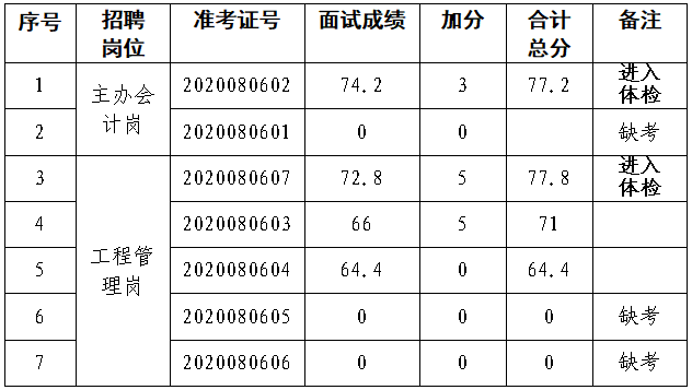 根據(jù)《黃山市徽城投資集團(tuán)有限公司招聘考試公告》,面試工作已于2020年8月8日結(jié)束,現(xiàn)將考生的成績(jī)予以公告: