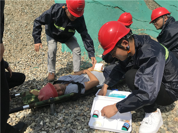 本場演練模擬了開發(fā)區(qū)砂石場內(nèi)因大雨導致堆料場一側(cè)發(fā)生坍塌,造成其中一名職工被部分掩埋。對此,鴻瑞公司應急救援指揮部在接到報告后立即組織各應急救援小組開展救援工作,不僅成功救出被掩埋職工,更是第一時間將其送往縣醫(yī)院醫(yī)治。